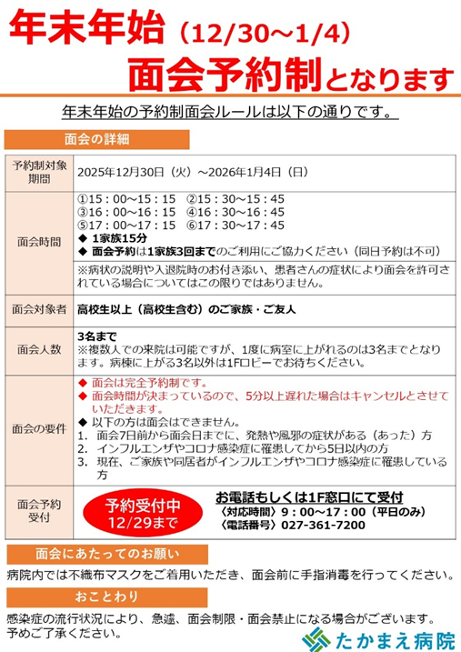 併せまして、年末年始(12月30日~1月4日)の面会については、告知の通り完全予約制にて実施いたします。